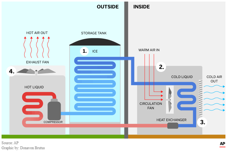 Thermal energy storage technologies, including chilled water and ice-based systems, are increasingly being deployed to shift energy use and reduce strain on electrical grids. Facilities such as hospitals and large commercial buildings are already leveraging “ice battery” systems that freeze water during off-peak hours and use it for cooling during peak demand periods. These systems can significantly reduce electricity usage and operational costs while improving reliability, making them particularly attractive for energy-intensive environments like data centers (AP News). As renewable energy sources such as solar and wind continue to expand, TES tanks are also becoming essential for balancing intermittent power generation with real-time demand.